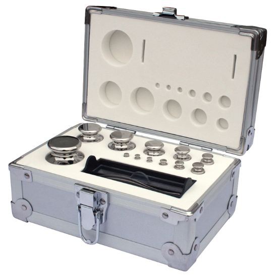 Coffrets avec des poids de précision en acier chromé de 1 g jusqu’à 2 kg.
