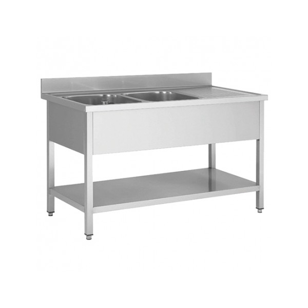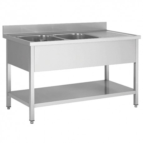 Plonge démontable sur pieds carrés, étagère pleine, en inox AISI 201, 2 bacs, égouttoir a gauche, L 1600 mm