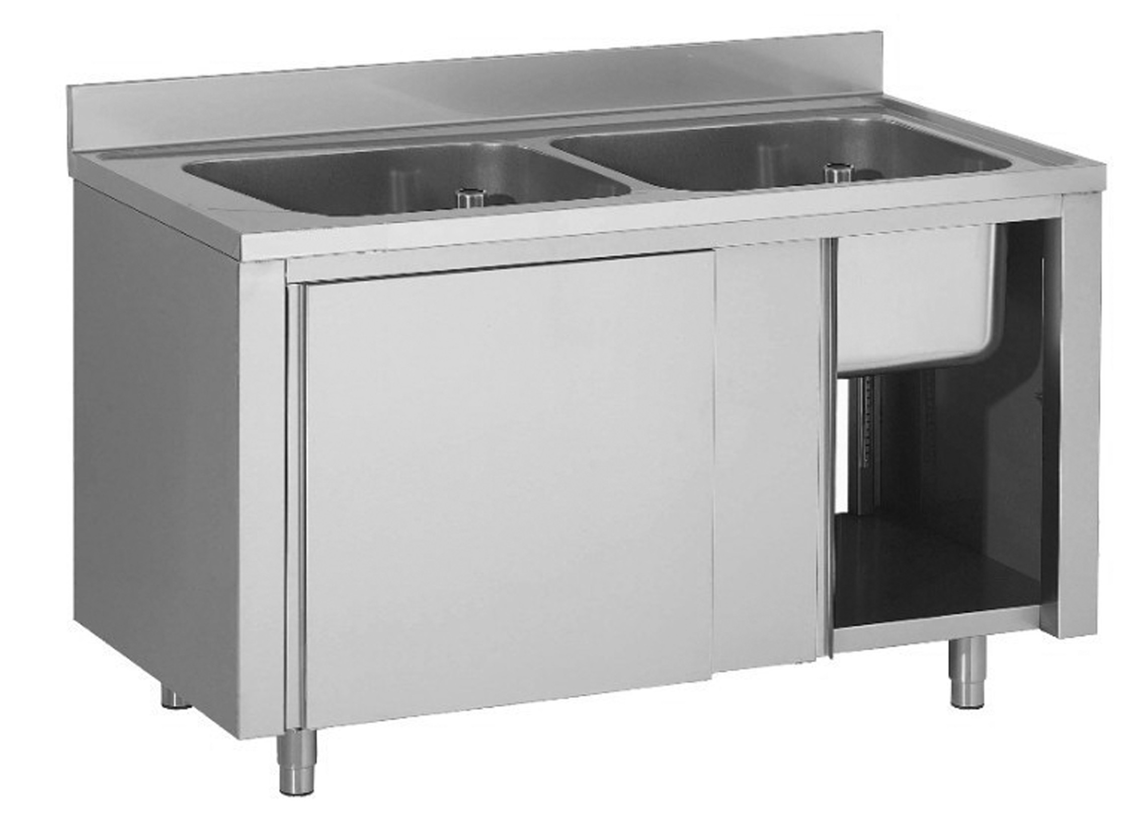 Plonge placard en inox AISI 304, porte coulissante, 2 bacs, L 1400 x P 700 mm