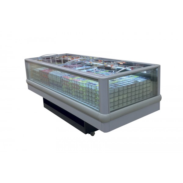 Ilôt de présentation bi-température YALOS 250 RV TB/TN, couleur gris anthracite RAL 7016, parfaite pour la présentation de glaces, de surgelés et/ou de produits frais et préemballés.
